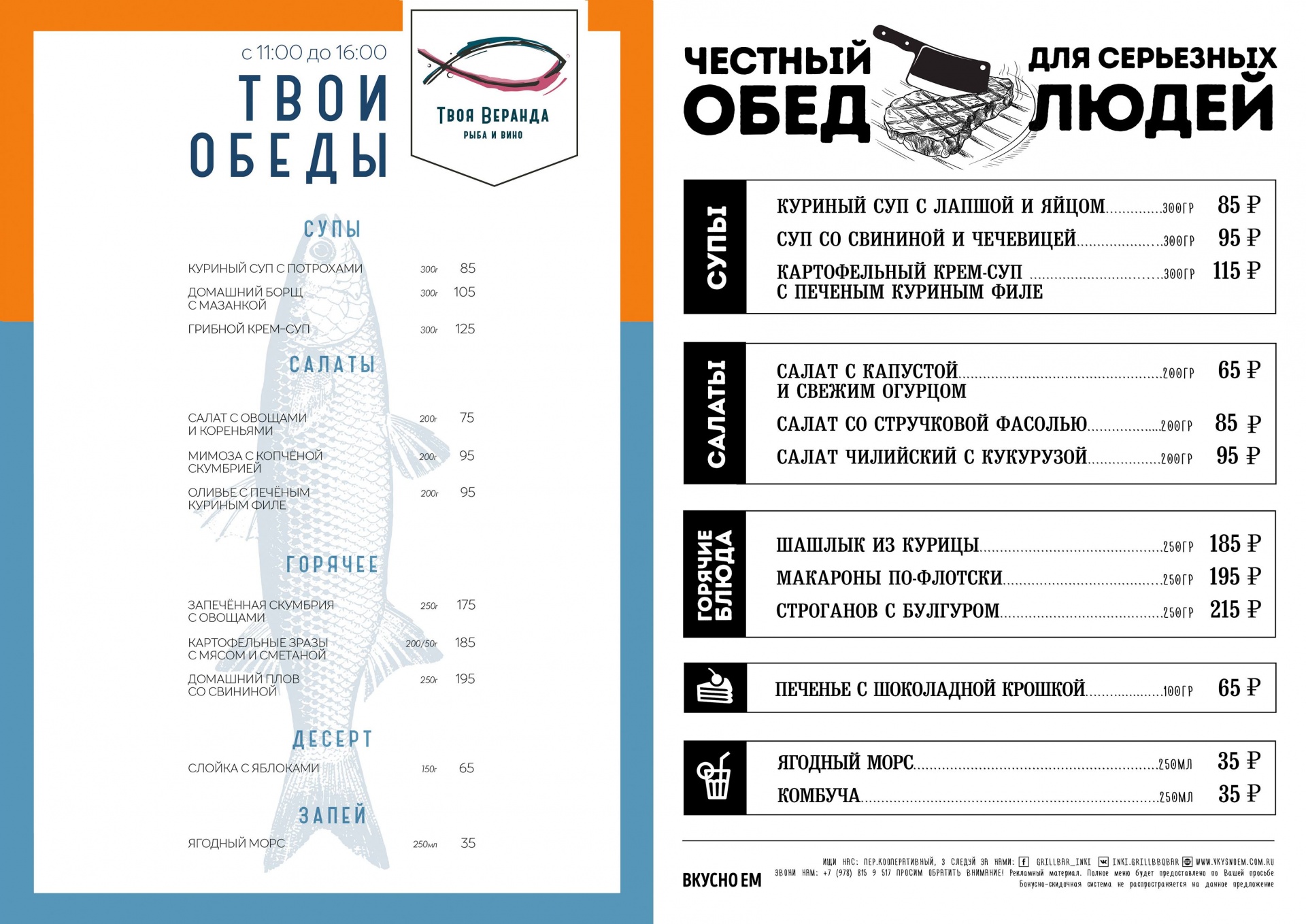 Каждую неделю с понедельника по пятницу Твоя Веранда. Рыба и вино, INKI.BBQ&BAR готовят обеды с 11:00 до 16:00!