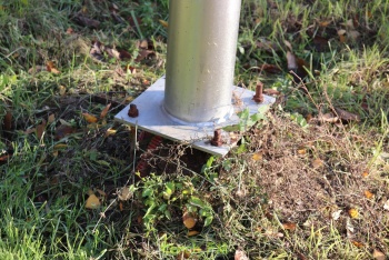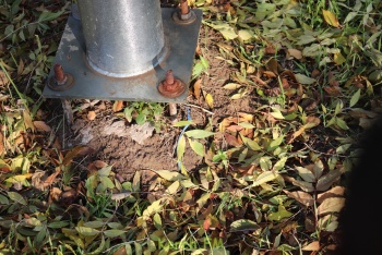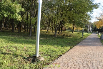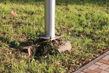 Также необходимо обратить внимание на устройство столбов освещения - основания приподняты над землей, закреплены болтами, которые торчат, кабели, подводящие электричество выведены наружу, что является нарушением технологических требований и правил безопасности.
