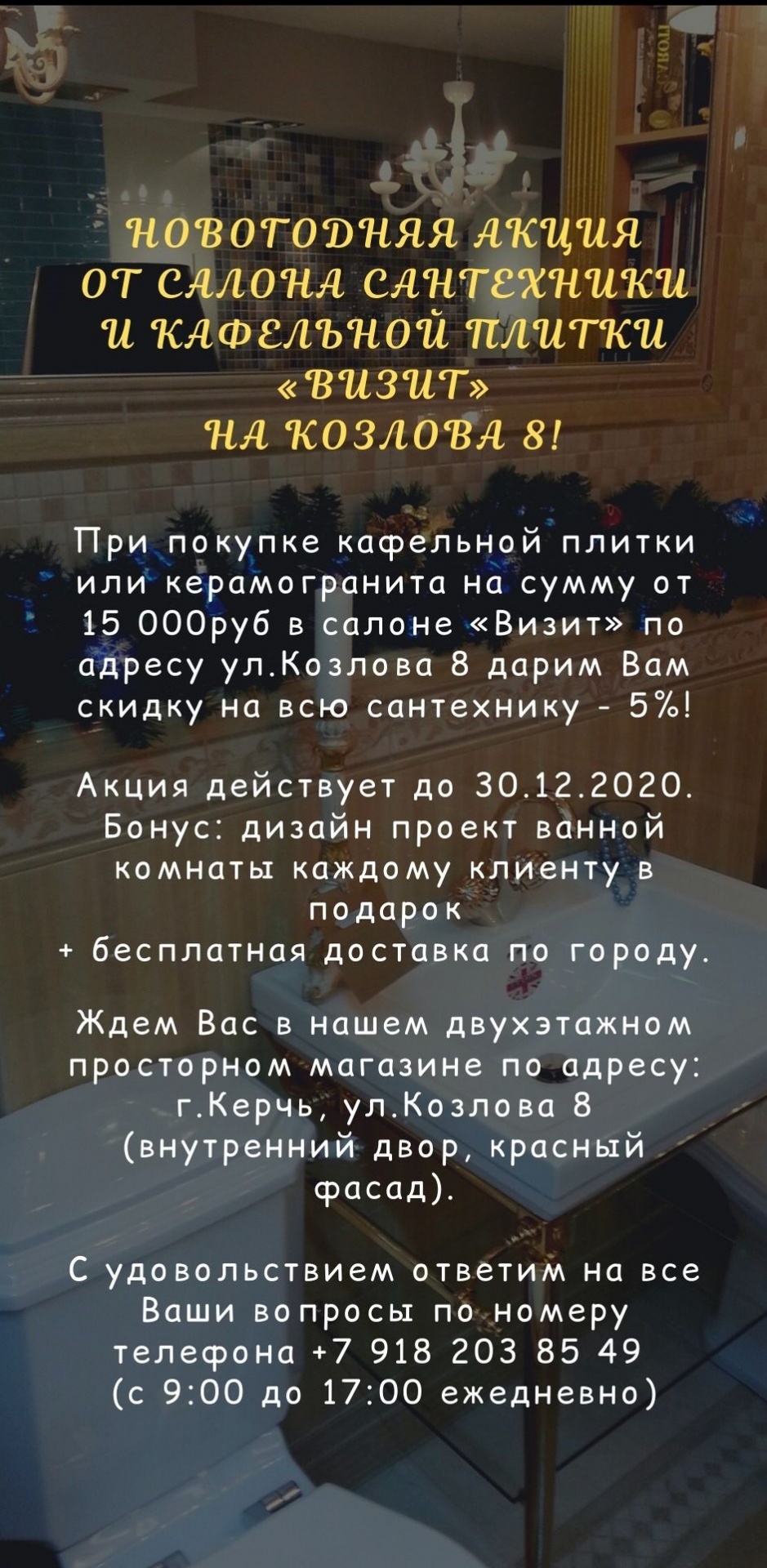 САЛОН САНТЕХНИКИ И КАФЕЛЬНОЙ ПЛИТКИ «ВИЗИТ» НА КОЗЛОВА 8 ДАРИТ СКИДКИ!