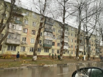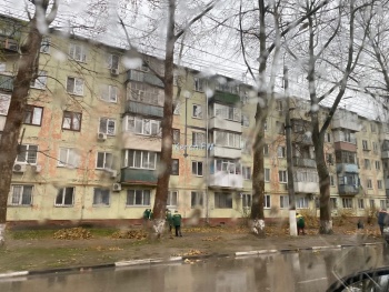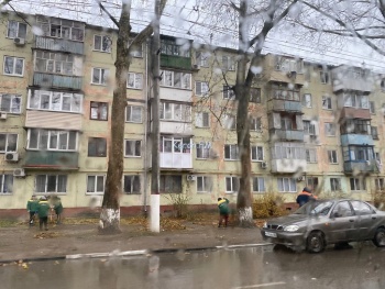 В Керчи рабочие убирают листву с газонов несмотря на дождь