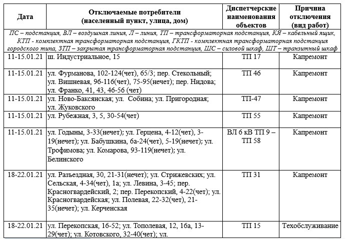 В связи с плановым ремонтом электрооборудования в январе в период с 8 до 17 часов будут происходить отключения линий электропередачи согласно нижеприведенному графику. Об этом сообщает ГУП РК «Крымэнерго», - передает Керчь.ФМ.