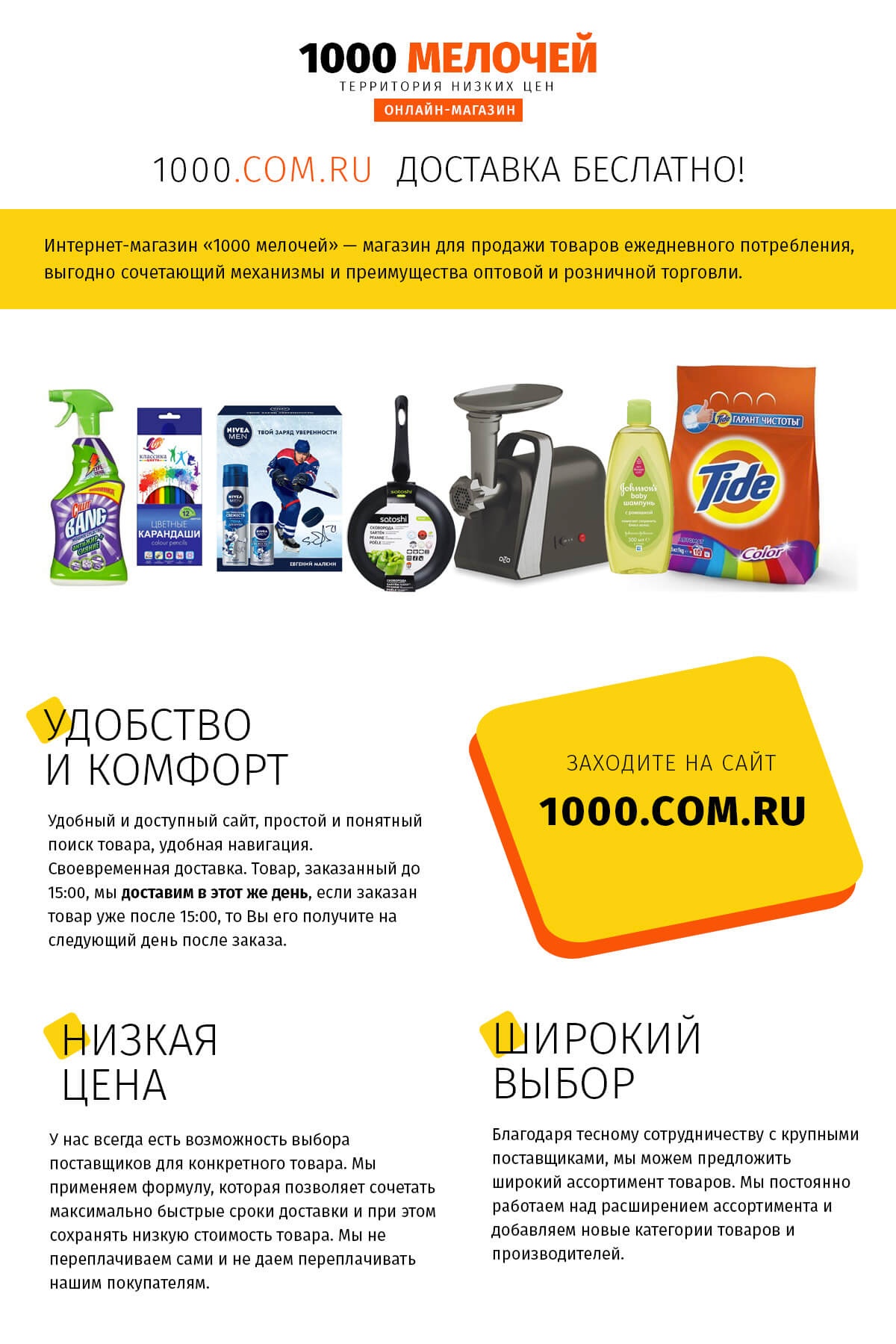 Интернет-магазин «1000 мелочей» с бесплатной доставкой - магазин для продажи товаров ежедневного потребления, выгодно сочетающий механизмы и преимущества оптовой и розничной торговли