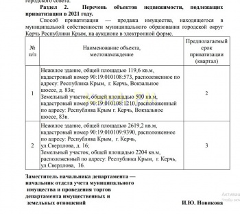 На прошедшей вчера сессии горсовета керченские депутаты приняли план работы на 2021 год. Приватизации подлежат бывший недострой милиции на участке 2204 кв.м.  в самом центре города и нежилое здание с земельным участком, - передает Керчь.ФМ.
