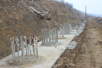 Сегодня производят армирование второго ростверка - элемента подпорной стены. А к концу года планируют его забетонировать. Продолжается бурение свайного фундамента из буронабивных свай. На сегодняшний день пробурено 147 свай из 391. Ведутся земляные работы по разгрузке оползневого участка, сооружается ограждение для емкостей объемом 350 кубометров для сбора воды.