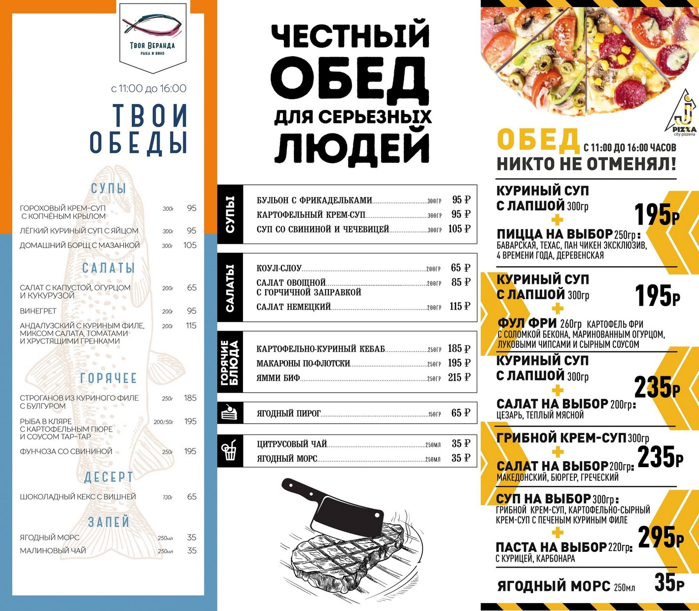 Наши обеды заряжают на успех каждую неделю с понедельника по пятницу с 11:00 до 16:00! Честно, сытно, вкусно и экономно, а почему? Так откровенно с любовью же!