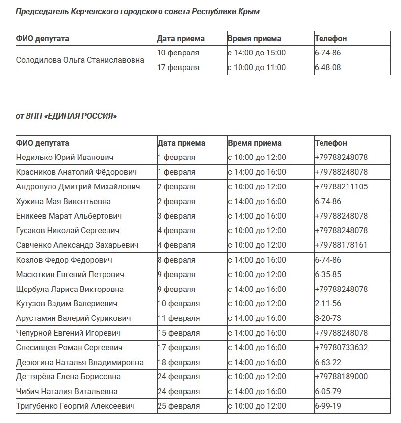 Пресс-служба горсовета Керчи сообщает график приема граждан в телефонном режиме депутатским корпусом Керченского городского совета 2 созыва в феврале 2021 года, - передает Керчь.ФМ.