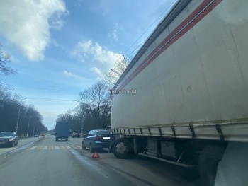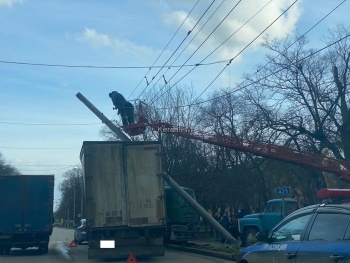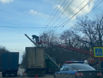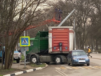 По состоянию на 15.00 работает бригада, которая поднимает опору с фуры. Авария произошла перед пешеходным переходом.