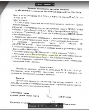 Курирующий зам Алексей Гуськов выслал в адрес керчанки выписку из протокола, согласно которой комиссия по безопасности дорожного движения заседала 4 месяца - с 31 января 2020 по 22 мая в составе в составе 9 человек (с указанием фамилий и должностей). Когда женщина обратила на это внимание, курирующий зам прислал другой вариант выписки. По ней уже заседали только 22 мая, но в количестве 8 человек (пофамильно). Ни в том, ни в другом варианте представителя МЧС не было.