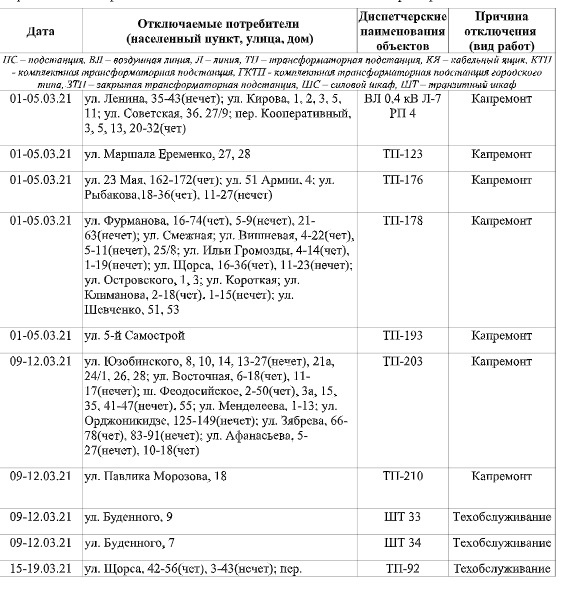 В связи с плановым ремонтом электрооборудования в марте в период с 8 до 17 часов будут происходить отключения линий электропередачи согласно нижеприведенному графику. Об этом сообщает ГУП РК «Крымэнерго», - передает Керчь.ФМ.