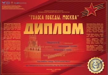 «В феврале Ансамбль танца «Керчаночка» (руководитель Гайворонская О.А.) принял участие в Международном конкурсе музыкально - художественного творчества «Голоса Победы. Москва» — первого конкурса из цикла «Голоса Победы», в который входит плеяда заочных конкурсов в городах-героях ВОВ. В веках подвиг предков бесценный. И пусть год Великой Победы все дальше от потомков, наш долг - сохранить в сердцах величайшие любовь и благодарность, помнить душой эхо войны. Ансамбль танца «Керчаночка» предоставил на конкурс Патриотический танец «Дети войны» и был награжден Дипломом Лауреата II степени. Педагоги были удостоены Благодарственными письмами. В творческом отзыве экспертный совет конкурса поблагодарил Ансамбль танца «Керчаночка» за участие в конкурсе, за нашу танцевальную композицию, за воспитание подрастающего поколения в духе патриотизма и вклад в развитие детско-юношеского творчества!», - говорится в сообщении