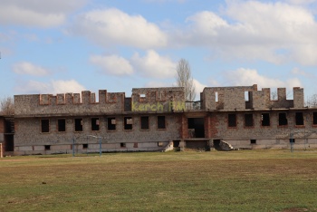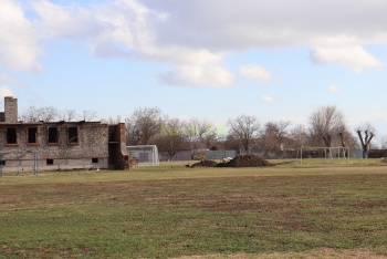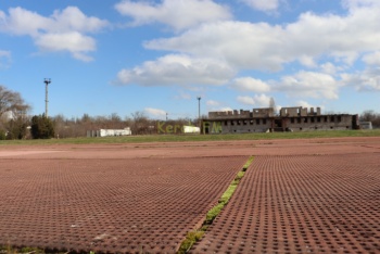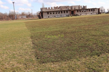 С заброшенного частично недостроенного здания спортивного комплекса вылетают камни, сгнивший остов футбольных ворот лежит на земле, ямы для прыжков в длину в зарослях сухостоя и грязи.