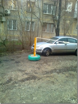 Как оказалось, шлагбаум этот с основанием залитым в автомобильные покрышки установили не жители дома, а соседнее здание, в котором находится колония-поселение по адресу Кирова, 75