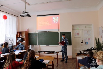 В рамках «урока мужества» сотрудники ОМОН рассказали учащимся 9 классов об истории создания войск правопорядка и о современных войсках национальной гвардии, а также продемонстрировали детям фильм о Росгвардии.