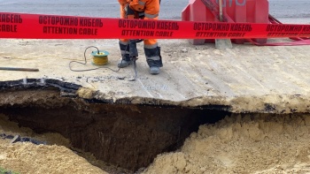 Рабочие с помощью спецтехники снимают еще часть асфальта. Уже завезли новые трубы. Место работ ограждено и установлены предупреждающие дорожные знаки.