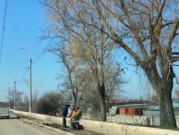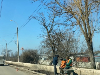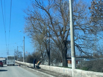 В Керчи 27 марта коммунальщики убирают тротуар на Горьковском мосту. С помощью щеток и лопаты они убирают грязь