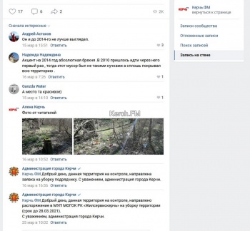 В редакцию Керчь.ФМ еще 15 марта обратились постоянные читатели с жалобой на мусор в Казенном парке. Тогда, администрация Керчи с верифицированного аккаунта в группе «Керчь.ФМ» Вконтакте ответила дважды.