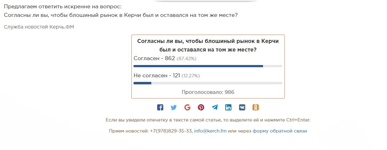Три недели назад редакция провела опрос среди читателей "за" и "против" блошиного рынка в Керчи. Не согласны с наличием "блошки" 12, 27%, согласны 87, 42%.