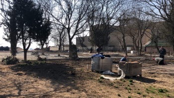На территории работает техника. Зонирование территории произошло иначе: теперь новые участки приводят в порядок - ровняют основание и вымащивают плиткой.