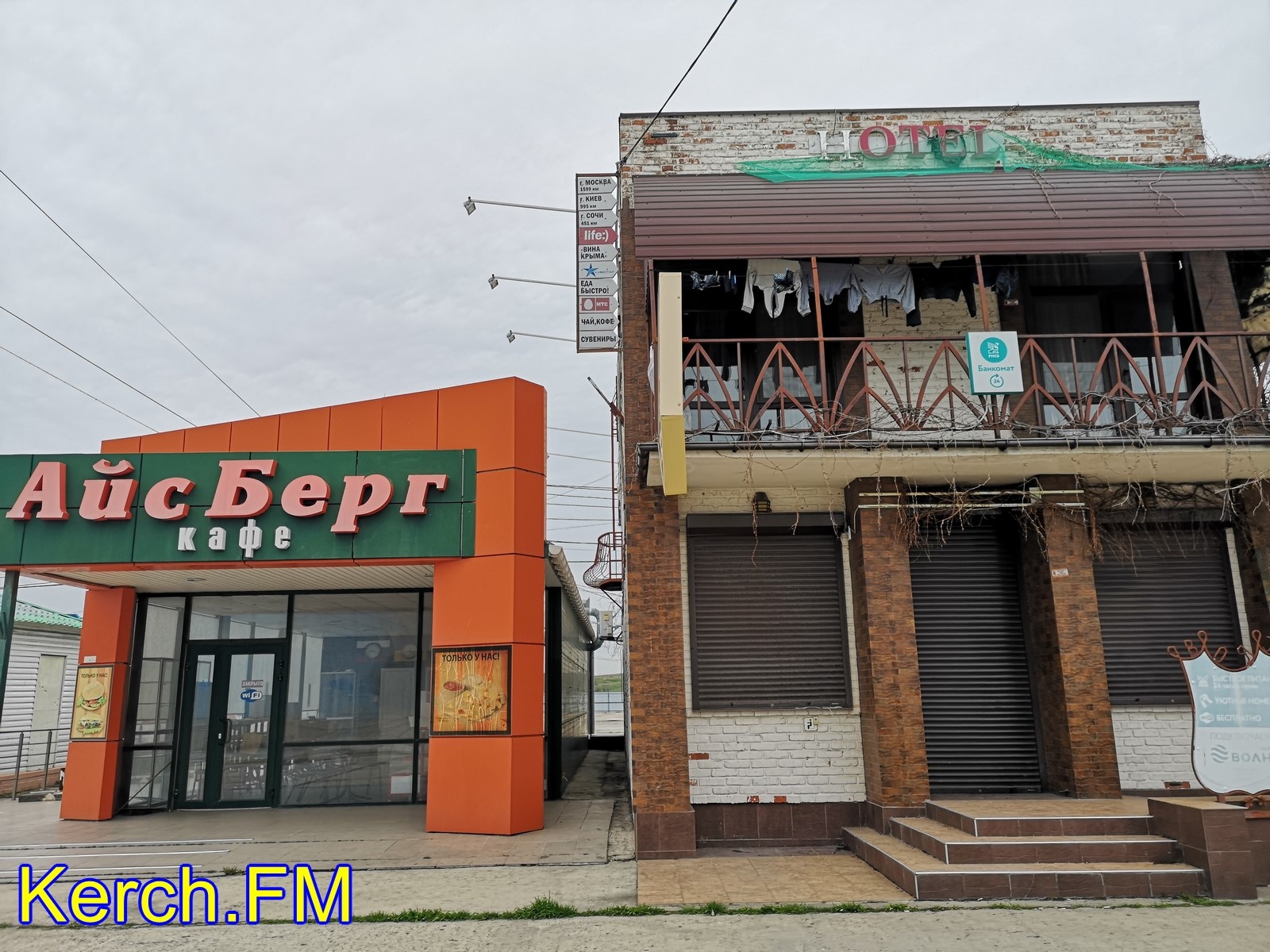 Территория отстойника ограждена забором, почти все двери опечатаны. На территории остались магазины, в которых до сих пор находится техника. На здании мотеля «Вояж», где люди ночевали, когда работа паромной переправы приостанавливалась из-за шторма, сушатся чьи-то вещи. Местами валяются остатки от конструкций, которые разобрали. На территории второго отстойника стоит автомобиль морской дирекции и, судя по всему, охранник, так как во время нашего визита, за нами пристально наблюдали издалека.