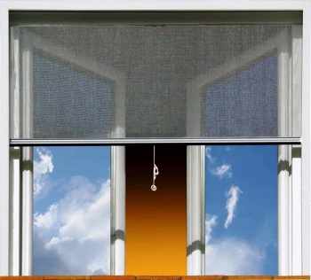 Специальный контейнер крепится в верхней части оконного или дверного проема. В нем в скрученном виде находится валик из рулонной сетки. За специальную ручку или шнур полотнище можно растянуть и перекрыть открытый проем, зафиксировав край полотнища внизу. Эта конструкция хороша для тех проемов, которые часто необходимы полностью открытыми.