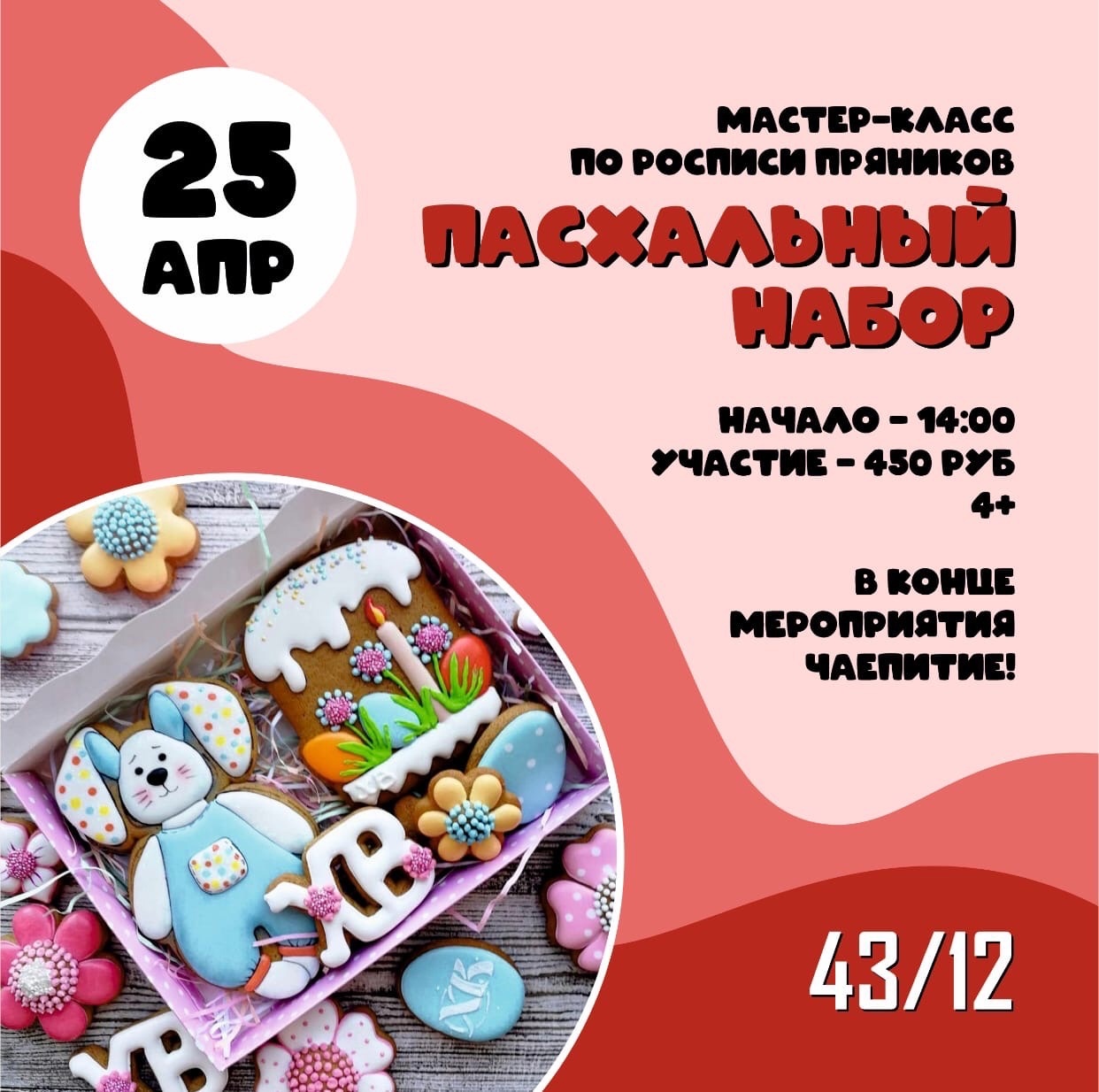 мастер-класс по росписи пряников. Каждый участник распишет подарочный набор из пряников на пасхальную тему. В конце мероприятия по желанию можно остаться на чаепитие или забрать угощения в коробочке домой. Возрастная категория — 4+. Стоимость участия — 450₽.