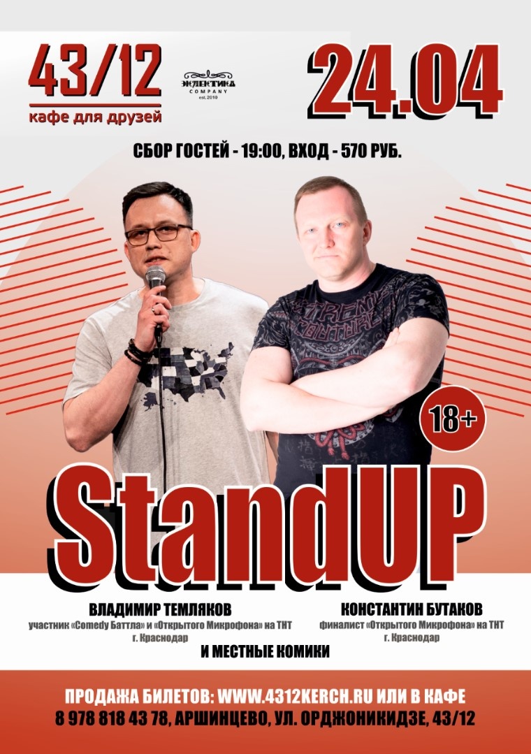 24-го апреля, в субботу, кафе 43/12 приглашает друзей на StandUp, участие в котором примут комики из Краснодара и Керчи. Приглашенные гости: