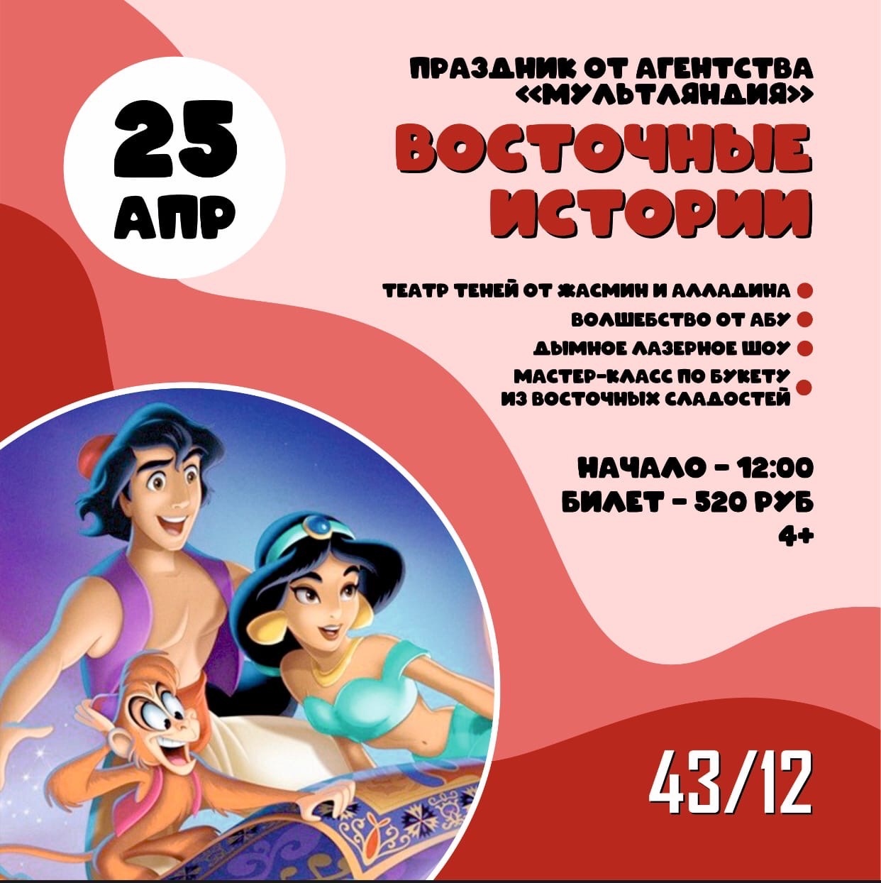 праздник от агентства «Мультляндия» «Восточные истории» с Жасмин, Алладином и Абу. В программе: театр теней, волшебство от Абу, дымное лазерное шоу, мастер-класс по букету из восточных сладостей. Возрастная категория — 4+. Стоимость участия — 520₽.