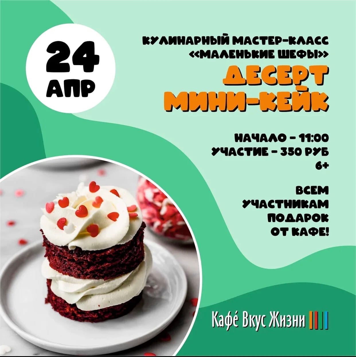 24.04, 11:00 - кулинарный мастер-класс для детей по приготовлению десертов мини-кейков. Стоимость участия — 350₽. Возрастная категория — 6+. Всем участникам подарок от кафе!