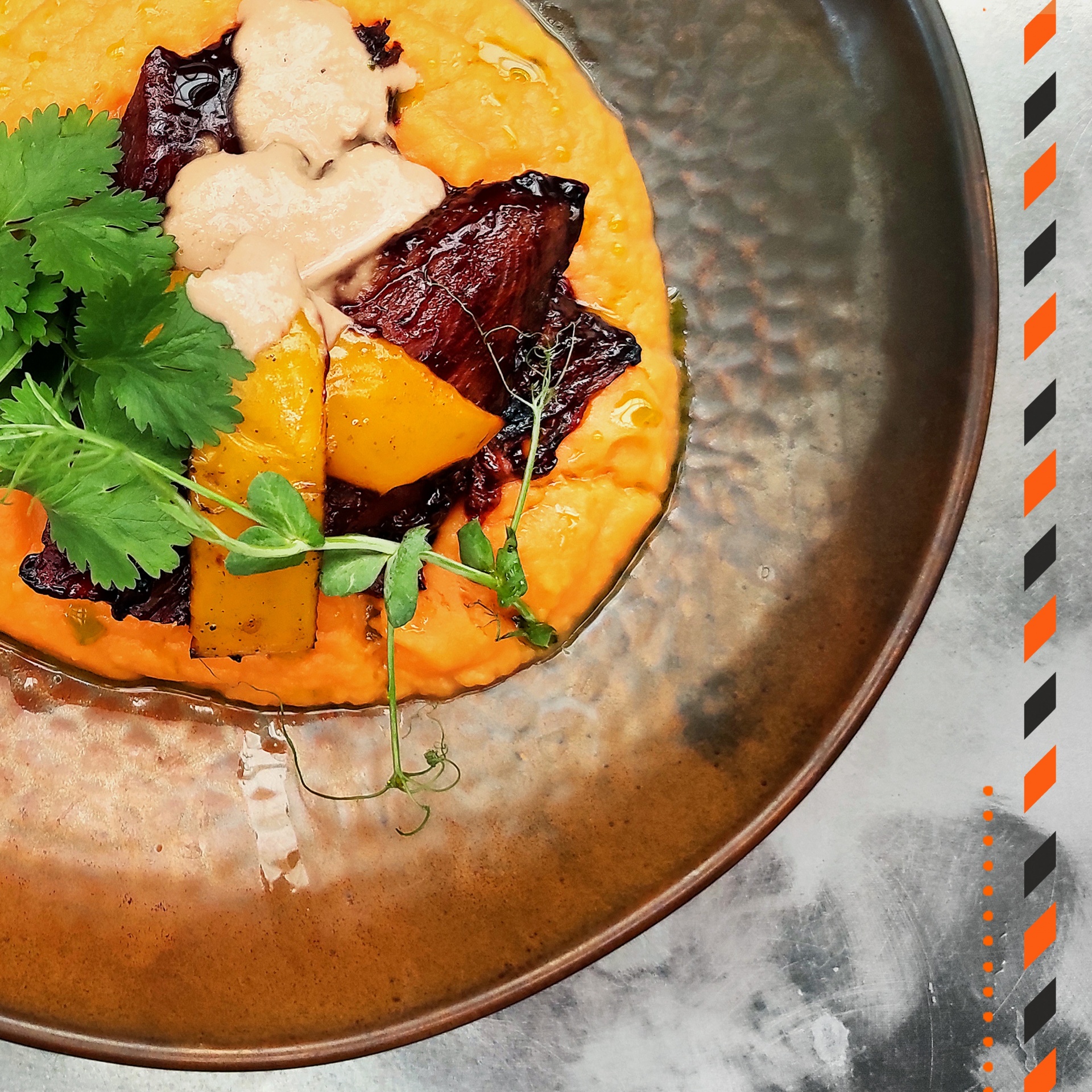 - Язык-гриль: томленый говяжий язык, обданный сладковато-пряным соусом хойсин и запеченный на углях, ароматное пюре из батата, запеченный болгарский перец и грибной соус. Раздел Мясо на сайте.