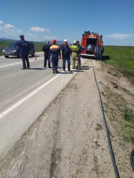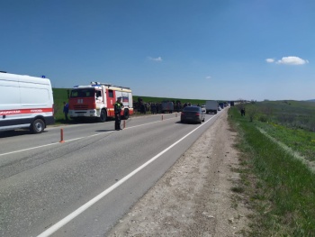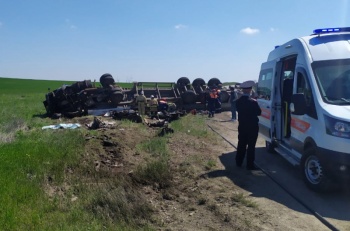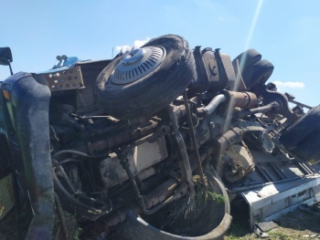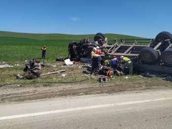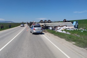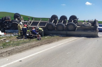 По предварительной информации, 30 апреля около 10 час. 45 минут 34-летний водитель автомобиля «ВАЗ-2107», двигаясь по автодороге Насыпное - Первомайское, допустил выезд на полосу встречного движения, по которой во встречном направлении двигался большегруз «МАЗ». Предположительно, пытаясь уйти от столкновения, водитель грузового автомобиля совершил маневр, в результате которого фура опрокинулась на бок и придавила отечественную легковушку.
