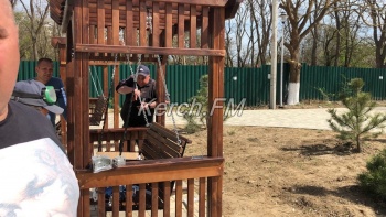 Днем 3 мая корреспондент Керчь.ФМ выехал на место, чтобы посмотреть на эти качели. Здесь работала бригада, которая устанавливала обратно упавшие качели, приваривала детали. Во время съемки, к журналистке подошел мужчина, который не был одет в рабочую форму. Он начал хватать журналиста за руки и запрещать снимать.