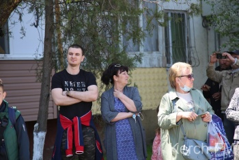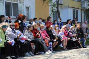 Поздравить ветерана приехало также руководство города. На улице собралось много желающих посмотреть на выступление. Многие люди вместе с артистами пели известные военные песни