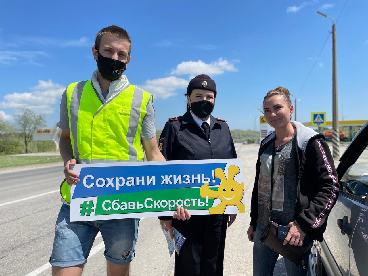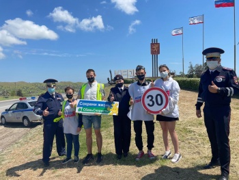 На въезде в город-герой Керчь молодые активисты, выстроившись вдоль проезжей части с хештегом «СбавьСкорость#сохраниЖизнь» и вооружившись дорожными знаками ограничения скорости 90, 60 и 30 км/час призвали водителей к необходимости выбора разумного скоростного режима.