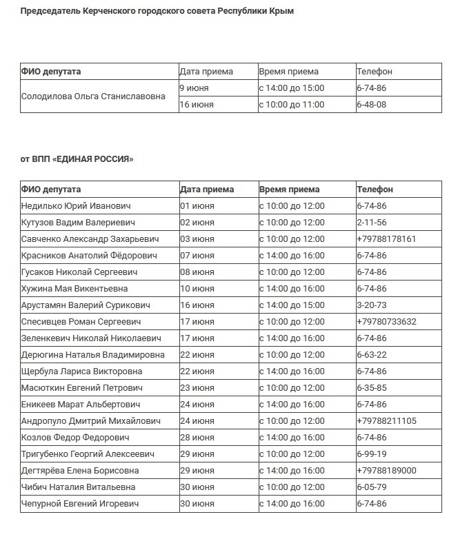 Пресс-служба горсовета Керчи сообщает время приема граждан в телефонном режиме депутатским корпусом Керченского городского совета 2 созыва в июне 2021 года, - передает Керчь.ФМ