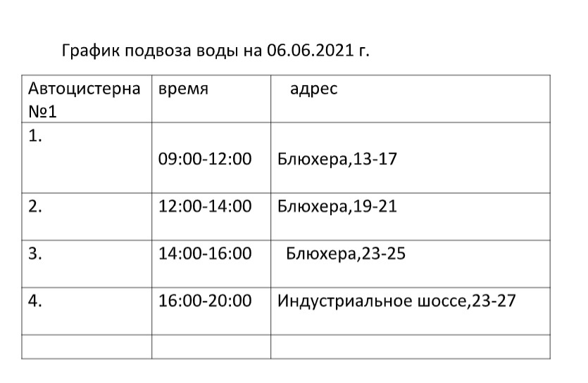 На период отключения воды в вышеуказанном районе будет организован подвоз воды автоцистерной, согласно графика подвоза 06.06.