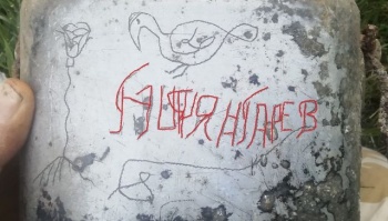 Однако медальон не оправдал ожиданий, вкладыш оказался нечитаемым, сильно поврежденным. Помог котелок - на нем были нацарапаны рисунки: роза и птица, похожая на гуся. А самое главное — надпись. Буквы крупные, но неразборчивые, непонятно: то ли имя с фамилией, то ли одна фамилия. Поисковики, имеющие опыт в прочтении похожих надписей, прочитали надпись как "Борян (Ботян, Бытян) Гарев".