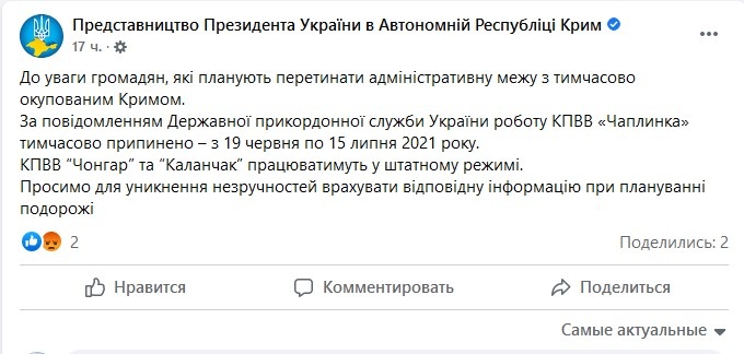"По уведомлению Государственной пограничной службы Украины, работа КПВВ "Чаплинка" временно прекращена - с 19 июня по 15 июля 2021 года", - говорится в сообщении.