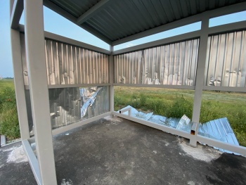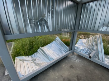 Если в конце мая на остановочных павильонах были лишь вмятины, то на сегодня железные листы выбиты, а при сильном ветре существует возможность того, что их ветром сдует на территорию ближайших домов.