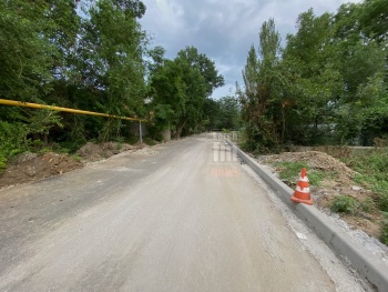 В настоящее время дорога на участке заасфальтирована, пара рабочих укладывает бордюры, таская их в руках с одного конца улицы на другой.
