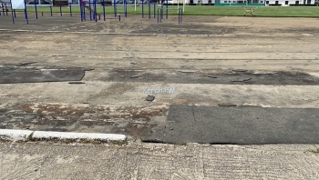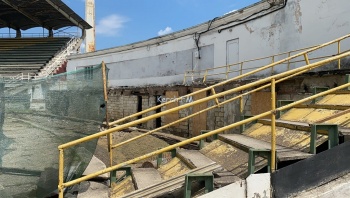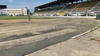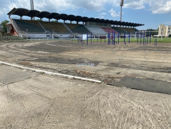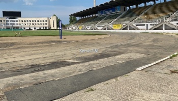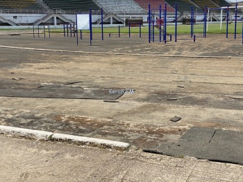 Ворота вернули на место, теперь на них написано, что стадион не работает. Специалисты приступили к демонтажу покрытия беговых дорожек. Они пришли в негодность.
