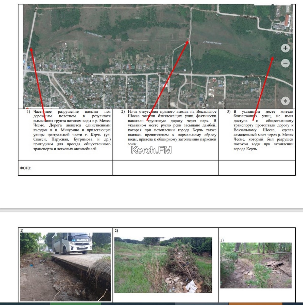 «Длительное я время проживаю по адресу: г. Керчь, ул. Парусная, 2. Данная улица фактически расположена на смежном массиве с п. Мичурино. Также вблизи расположены ул. Скасси, ул. Бутримова, ул. Тиритакский вал, которые также не относятся к п. Мичурино, представляют собой обособленный коттеджный поселок. Из-за отсутствия прямого дорожного сообщения с Вокзальным шоссе въезд осуществляется через единственную асфальтированную дорогу, связывающую указанное шоссе и п. Мичурино в районе Аэропорта. Данная дорога пересекает русло р. Мелек Чесме.