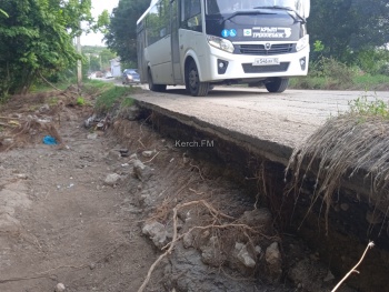 В результате затопления г. Керчи в июне 2021 года участок дороги на въезде в поселок полностью ушел под воду, при этом был в значительной степени размыт мощным течением. Потоком воды снесло опору ЛЭП, размыло насыпь под асфальтовым покрытием, вымыло грунт, усиливающие железобетонные элементы фактически часть асфальтированного покрытия висит в воздухе. Так как данный въезд является единственным, по нему в ежедневном режиме осуществляется проезд автотраснспорта, в том числе и общественного. Фото прилагаю. Местными властями полностью проигнорирован тот факт, что в любой момент может произойти обрушение дороги.