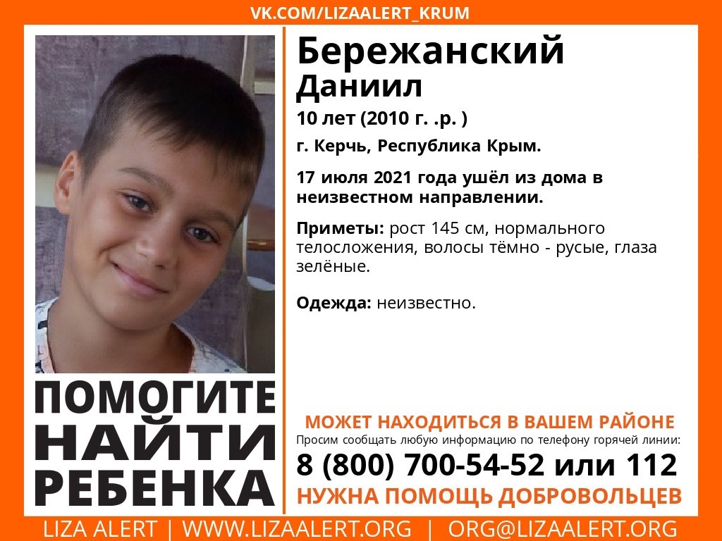 В Керчи пропал десятилетний мальчик Даниил Бережанский. Со вчерашнего дня его ищут полиция и волонтеры поискового отряда «Лиза Алерт», - передает Керчь.ФМ.