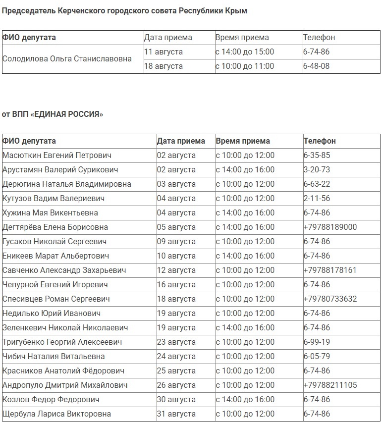 Пресс-служба горсовета Керчи сообщает график приема граждан в телефонном режиме депутатским корпусом Керченского городского совета 2 созыва в августе 2021 года, - передает Керчь.ФМ.