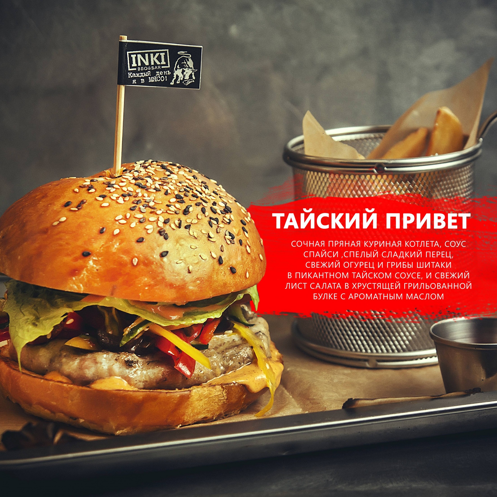 «Тайский привет» с сочной пряной куриной котлетой, соусом спайси, спелым сладким перцем, свежим огурцом и грибами шитаки в пикантном тайском соусе и свежим листом салата. Собираем в воздушную грильованную булочку бриош и подаем с золотистым картофелем фри и кетчупом.