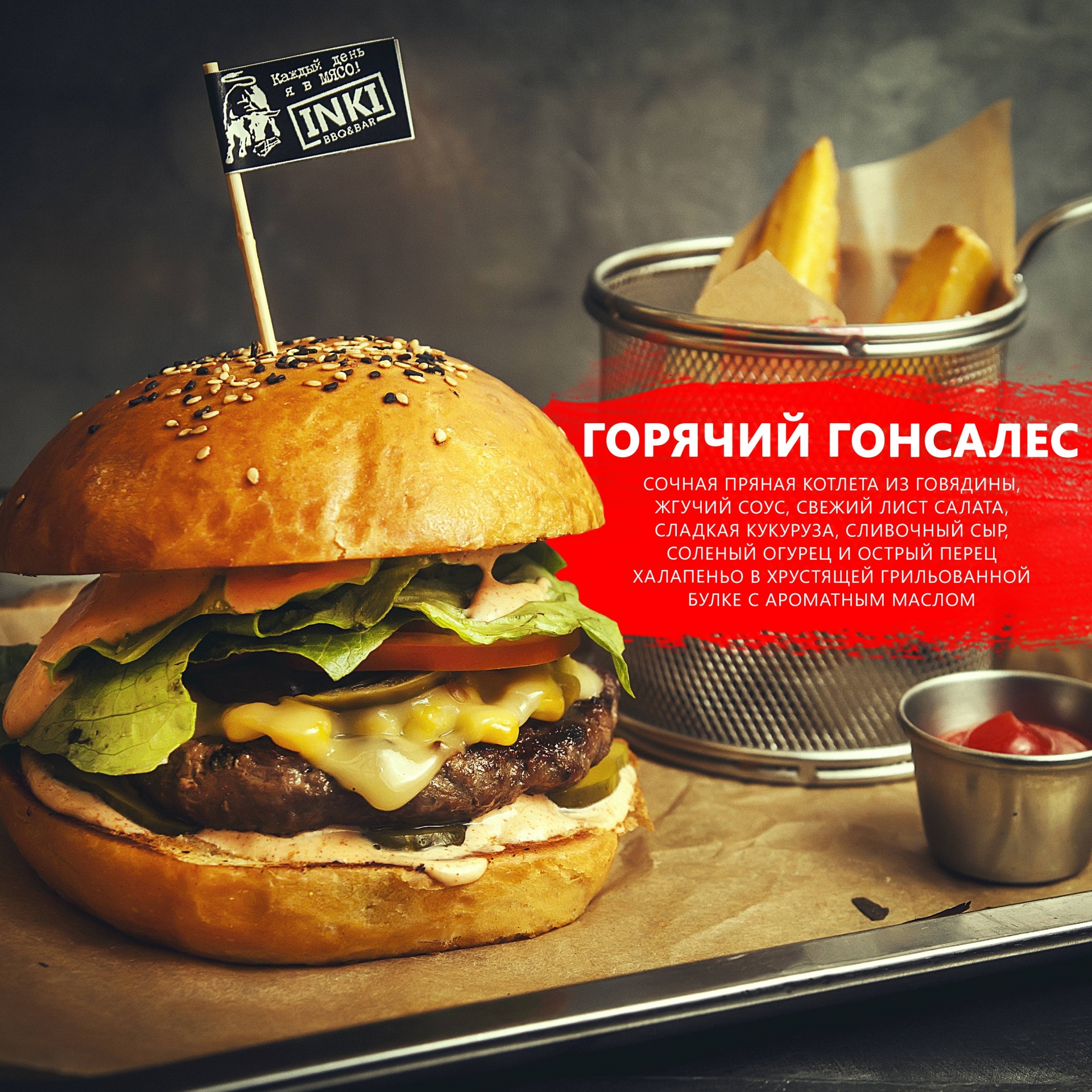 «Горячий Гонсалес» с сочной котлетой из говядины, жгучим соусом, свежим листом салата, сладкой кукурузой, сливочным сыром, соленым огурцом и острым перцем халапеньо. Собираем в воздушную грильованную булочку бриош и подаем с золотистым картофелем фри и кетчупом.