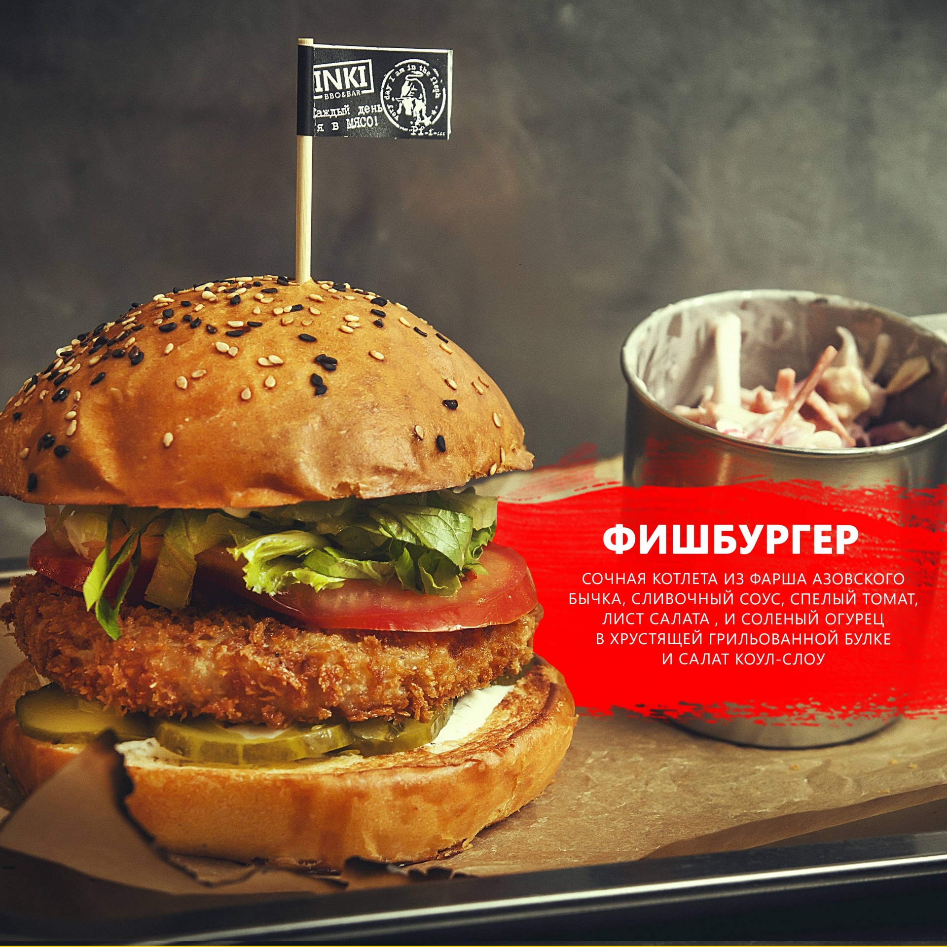 «Фишбургер» с сочной котлетой из фарша азовского бычка, сливочным соусом, спелым томатом, листом салатам и соленым огурцом. Собираем в воздушную грильованную булочку бриош и подаем с классическим салатом коул-слоу.