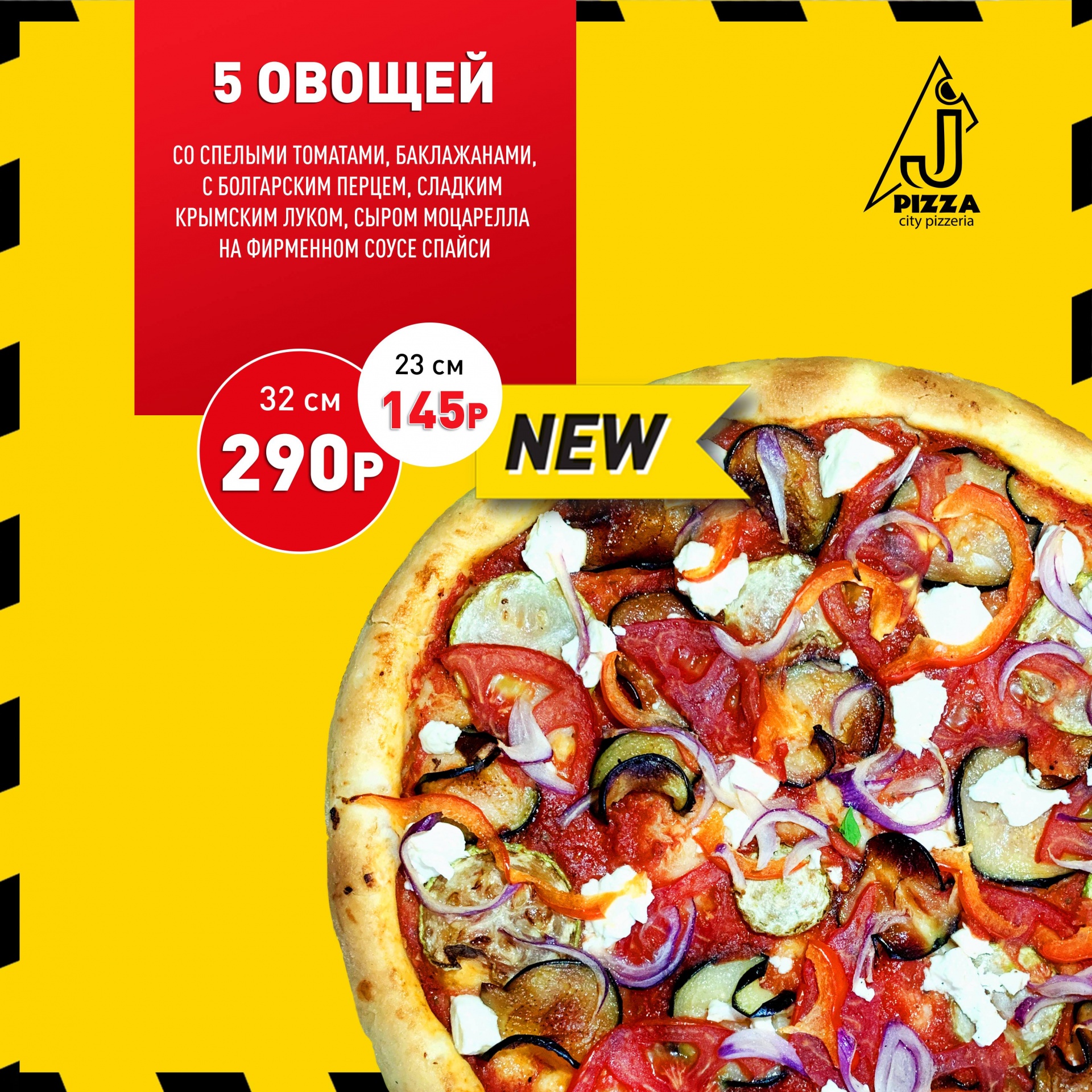 Пиццу «5 овощей» со спелыми томатами, баклажанами, болгарским перцем, сладким крымским луком, кабачками, с сыром фета на красном соусе.