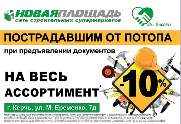 В связи с выпадением аномального количества осадков 17 июня, строительный магазин «Новая площадь» предоставляет скидку -10% на весь ассортимент продукции, за исключением материалов для сухого строительства, цемента, добавок к бетону, теплоизоляции, акционных товаров, скидка на которые не дублируется. Данную скидку можно получить в период с 9 по 31 августа, предъявив документы, подтверждающие нанесенный ущерб: для частных лиц - акт обследования жилого помещения, для ИП или ООО - акт обследования жилого помещения / справка о пострадавшем объекте.