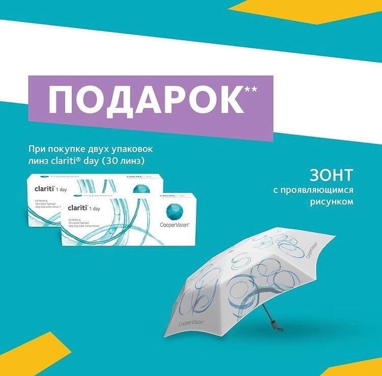 ТАКЖЕ, ПРИ ПОКУПКЕ 2х УПАКОВОК КОНТАКТНЫХ ЛИНЗ CLARITI 1 DAY ПОДАРОК — ЗОНТИК С ПРОЯВЛЯЮЩИМСЯ РИСУНКОМ!